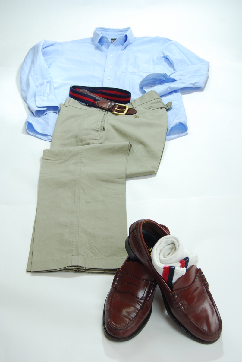 アイビーのネバならぬでいうと、メンズのベルトについては、ウールのパンツには革のベルトをあわせることと、革製品を身に付ける際には、財布などの小物も含めて色調をあわせることくらいである。